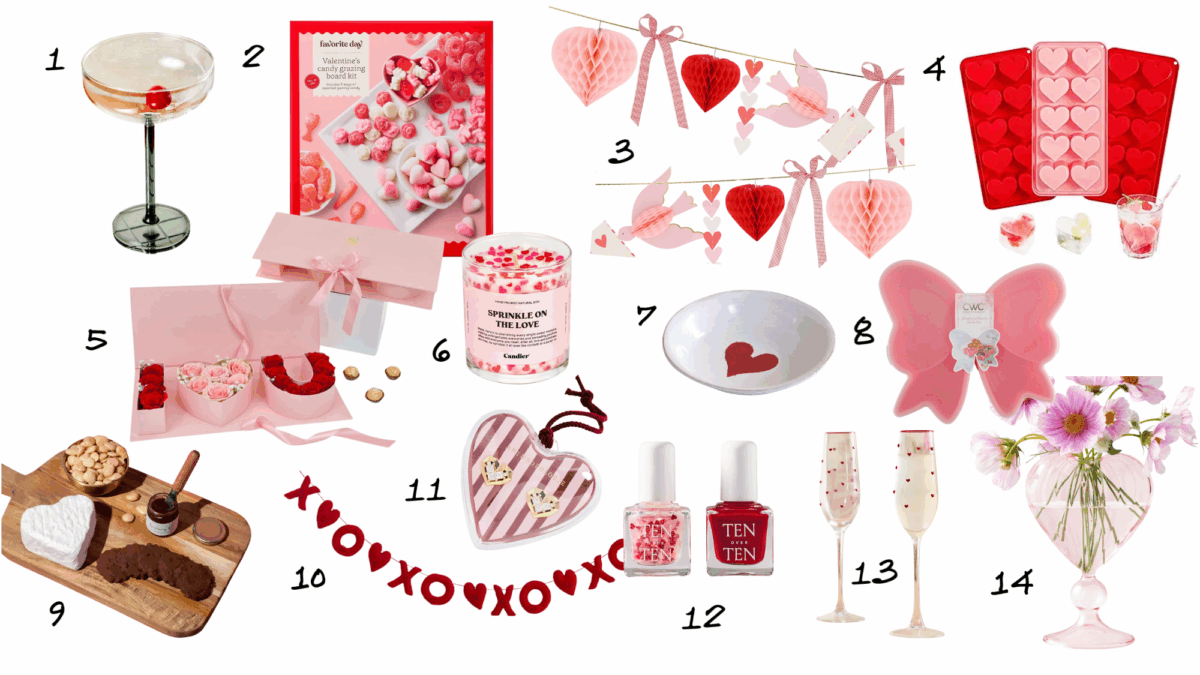 1. Coming Soon Manhattan Glass, 2. Valentine Candy Cuterie Kit, 3. Meri Meri Valentine Garland, 4. Heart Molds, 5. I Heart You Box, 6. Sprinkle Valentine Candle, 7. Astier de Villatte & John Derian Heart Dish, 8. Bow Box Container, 9. Valentine’s Cheese Collection, 10. Pottery Barn Felted XO Banner, 11. Heart Bobble Earrings Gift, 12. Tenoverten Valentines Nail Duo, 13. Heart Confetti Flutes, 14. Williams Sonoma Heart Glass Vase