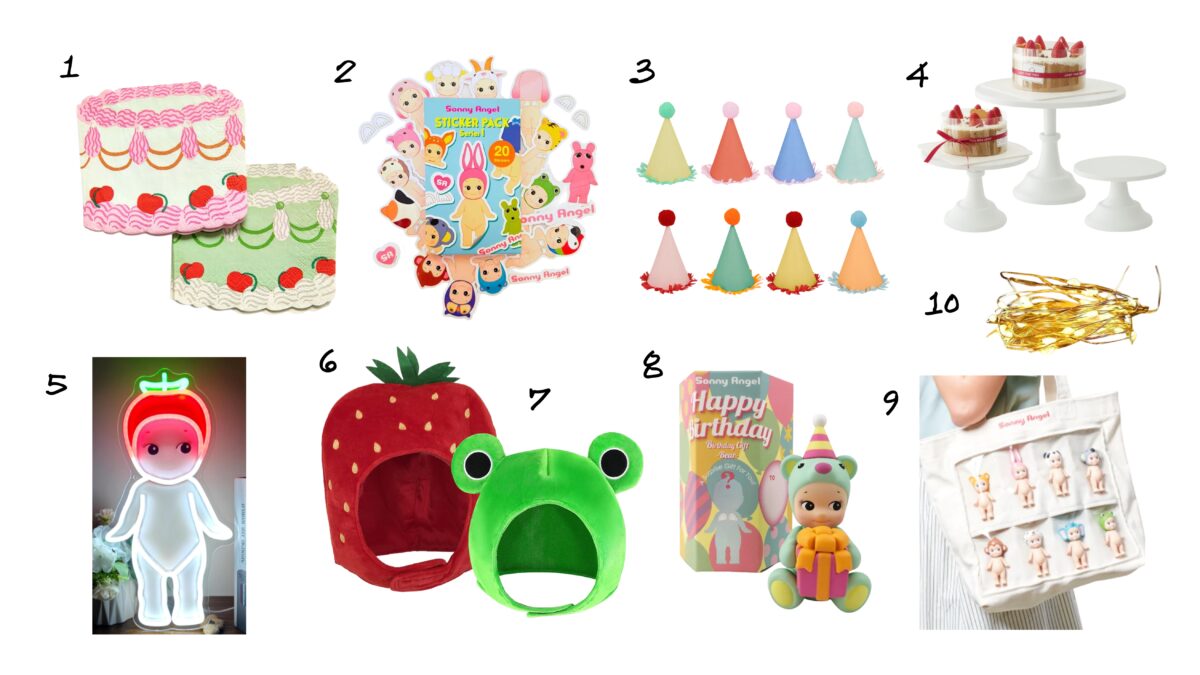 1. Paper Source Vintage Cake Napkins, 2. Sonny Angel Sticker Pack (Series 1), 3. Meri Meri Mini Party Hats, 4. Set of 3 White Cake Stands (also in pink!), 5. Sonny Angel LED Light, 6. Strawberry Hat, 7. Frog Hat, 8. Sonny Angel Birthday Blind Box, 9. Sonny Angel ‘My Crew’ Totebag