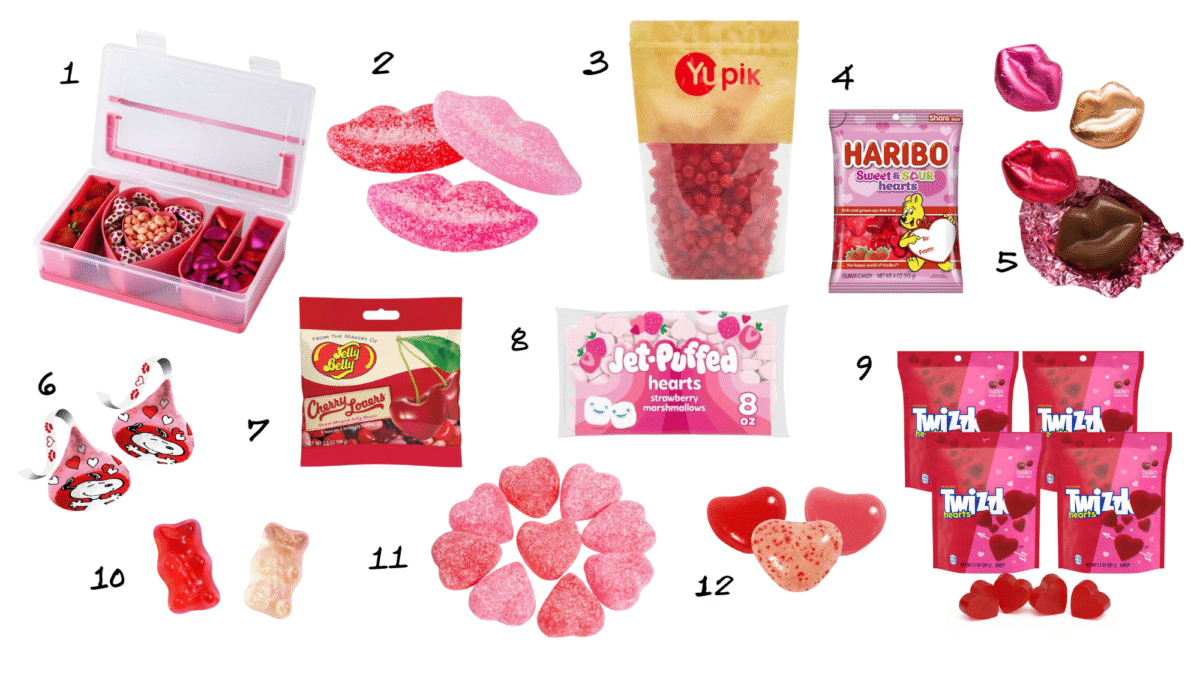 1. Message Snack Container Boxes, 2. Gummy Lips (also at Jelly Belly), 3. Cherry Sours, 4. Hairbo Sweet & Sour Hearts, 5. Madeline Chocolate Lips, 6. Snoopy Kisses, 7. Jelly Belly Heart Jellybeans, 8. Jet Puffed Strawberry Hearts, 9. Mini Heart Twizzlers, 10. Hairbo Gummy Bears, 11. Sour Patch Hearts, 12. Assorted Heart Jellybeans