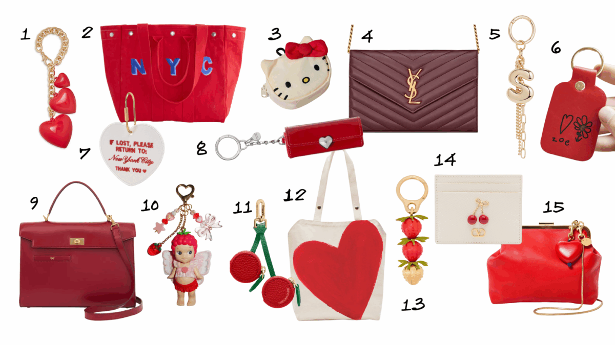 1. Roxanne Assoulin Puffy Heart Keychain, 2. Alex Mill Weekday Tote, 3. Baggu Hello Kitty Bag Keychain, 4. YSL Wine Bag, 5. Nordstrom Bubble Charm Keychain, 6. Custom Personalized Drawing Tag, 7. Abbode Heart NYC Keychain, 8. Kate Spade Lipstick Bag Charm, 9. Anya Hindmarch Mortimer Shiny Leather Top-Handle Bag, 10. Sonny Angel Custom Keychain, 11. MAISON de SABRÉ Cherry Charm, 12. Francis Valentine Canvas Heart Tote Bag, 13. Loewe Strawberry Bag Charm, 14. Valentino Cherry Leather Card Holder, 15. Clare V Flore w/ Grande Heart BagFob