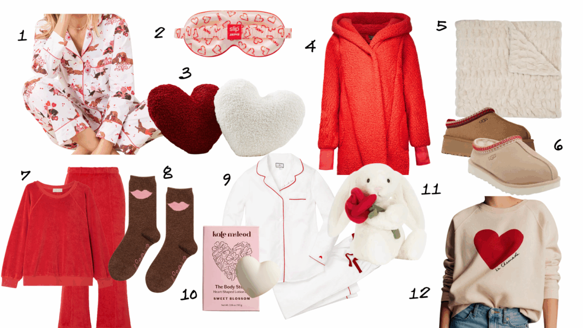 1.Print Fresh Long PJ Set in Dachshund Date, 2. Slip x Skims Eye Mask, 3. Pottery Barn Cozy Teddy Faux Fur Heart Shaped Pillow, 4. Jill Martin Classic Sherpa Lounger Jacket, 5. Lola Creamy Cloud Blanket, 6. Ugg Tassmans (light brown and dark brown platform), 7. Suzie Kondi Set, 8. Clare V Lip Cashmere Socks, 9. Petite Plume Made With Love PJs, 10. Kate McLeod Heart-Shaped Lotion Bar, 11. Jellycat Cream Bunny with Rose, 12. Sezane Heart Crewneck