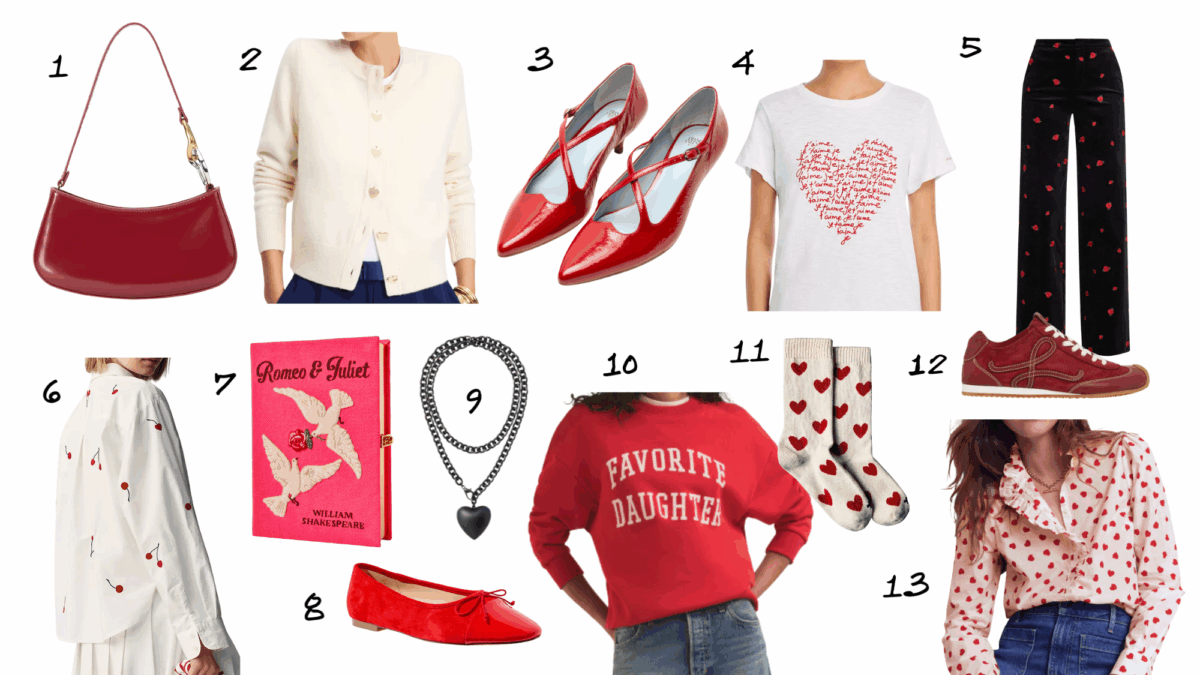 1. STAUD Ollie Shoulder Bag, 2. Kate Spade Gold Heart Button Nell Cardigan, 3. Francis Valentine Heart Heels, 4. Cinq à Sept Je T’Aime Heart Graphic Tee, 5. L’Agence Rose Embroidered Velvet Pants, 6. Anthropologie Cherry Buttondown Shirt, 7. Olympia Le-Tan Romeo Juliet Book Clutch, 8. Red Suede Ballet Flats, 9. Roxanne Assouline Puffy Heart Necklace, 10. Favorite Daughter Sweatshirt, 11. Imogene + Willie Heart Socks, 12. Loewe Ballet Runner Leather Sneakers, 13. Boden Isabel Ruffle Cotton Shirt