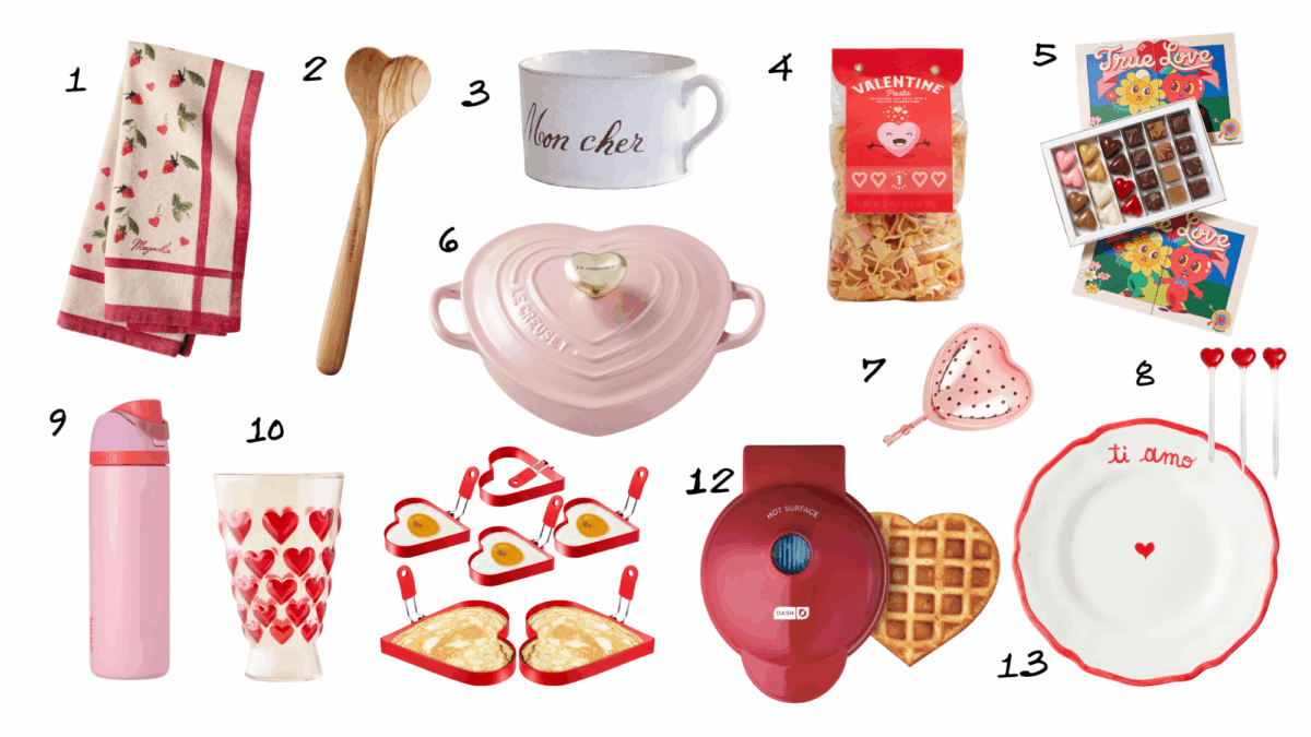 1. Magnolia Strawberries & Hearts Tea Towel, 2. Williams Sonoma Wooden Heart Spatula, 3. Astier de Villatte & John Derian Mon Cher Cup, 4. Heart Shaped Pasta (at Target, Walmart, and World Market), 5. And Sons Valentine Chocolate Set, 6. Le Creuset Enameled Cast Iron Shallow Heart Oven, 7. Heart Shaped Stainless Steel Tea Infuser, 8. Heart Icon Glass Martini Picks Set of 6, 9. Owala Free Sip 24oz Water Bottle, 10. Glass Heart Pattern Cup, 11. Heart Cooking Molds, 12. Heart Waffle Maker, 13. Hudson Grace Ti Amo Plate