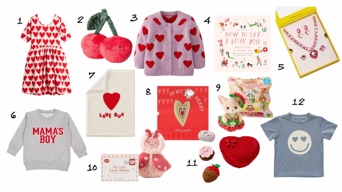 1. Quince Organic Cotton Skater Dress, 2. Mon Ami Foodie Friend Plush Kids Toy, 3. Hana Anderson Baby Valentine Cardigan, 4. Mr. Boddington’s Studio: How to Say I Love You, 5. Heart Jewels, 6. Mama’s Boy Sweatshirt, 7. Lovebug Blanket, 8. In My Heart: A Book of Feelings, 9. Calico Critter Surprise Bag, 10. Slumberkins Love Bug Plush and Love Letters Book/Kit, 11. Chocolate Box Plush, 12. Babysprouts Heart Eyes Smiley Tee