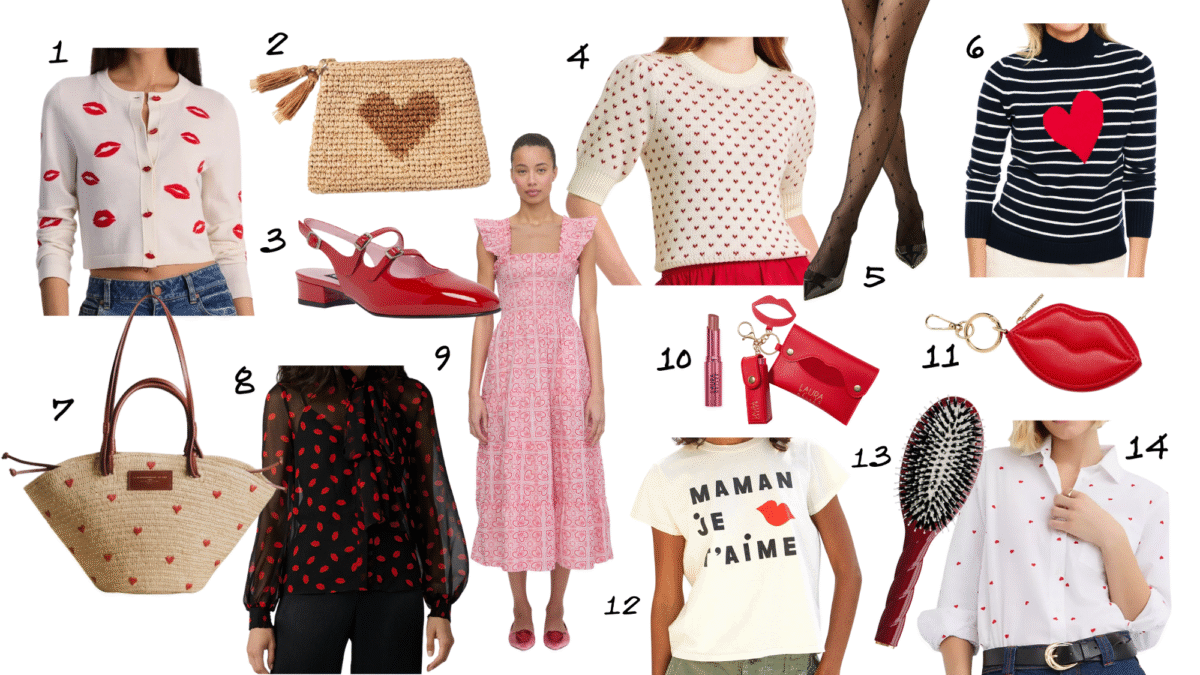 1.Alice & Olivia Lip Cardigan, 2. Aerin Woven Heart Bag, 3. Carel Peche Red Mary Jane Slingback, 4. Target Mini Heart Sweater, 5. Calzedonia Black Heart Tights, 6. Talbots Heart Sweater, 7. Sezane Heart Basket Bag, 8.Diane von Furstenberg Lip Blouse, 9. Hill House Pink Heart Dress, 10. Laura Geller Lipstick Holder, 11. Gap Lip Bag Charm, 12. Clare V Maman Je T’1aime Shirt, 13. La Bonne Brosse Burgundy Hairbrush, 14. Loft Heart Embroidered Shirt
