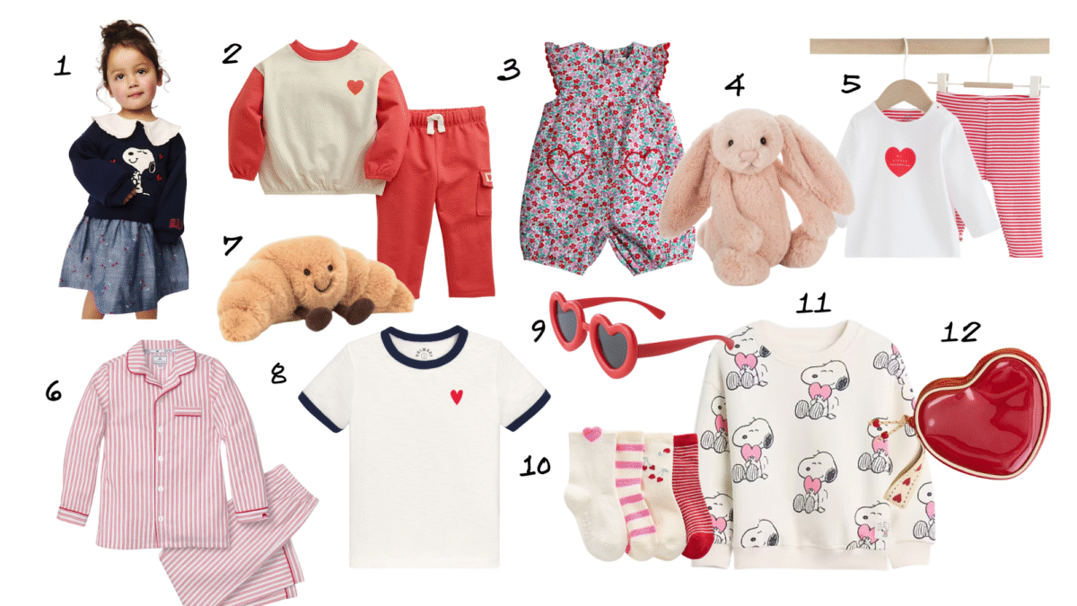 1. Gap Snoopy Heart Sweater Dress, 2. Baby Little Co Heart Lounge Set, 3. Jo Jo Maman Bebe Floral Jumper, 4. Blush Jellycat Bunny, 5. ‘My Little Valentine’ Heart Set, 6. Petite Plume Striped Kids PJs, 7. Jellycat Croissant Plush, 8. Primary Heart Tee – Maisonette, 9. Zara Kid’s Heart Sunglasses, 10. Gap Heart Sock Set, 11. Gap Snoopy Heart Sweatshirt, 12. Zara Kids Heart Bag