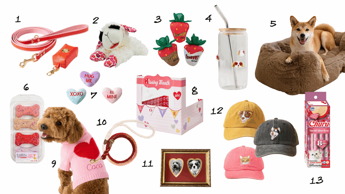 1. Mark & Graham Personalized Pet Leash, 2. Valentines Lambchop, 3. Yeowww Chocolate Strawberries Set, 4. Anthropologie Heart Eyes Dog Cup, 5. Lola Dog Bed, 6. Dog Treat Set, 7. Conversation Heart Cat Toys (Set of 5), 8. Kissing Booth Cat Scratcher, 9. Personalized Dog Sweater, 10. Found Gradient Dog Leash, 11. Double Heart Mat Frame, 12. Custom Pet Portrait Hat, 13. Churu Cat Treats