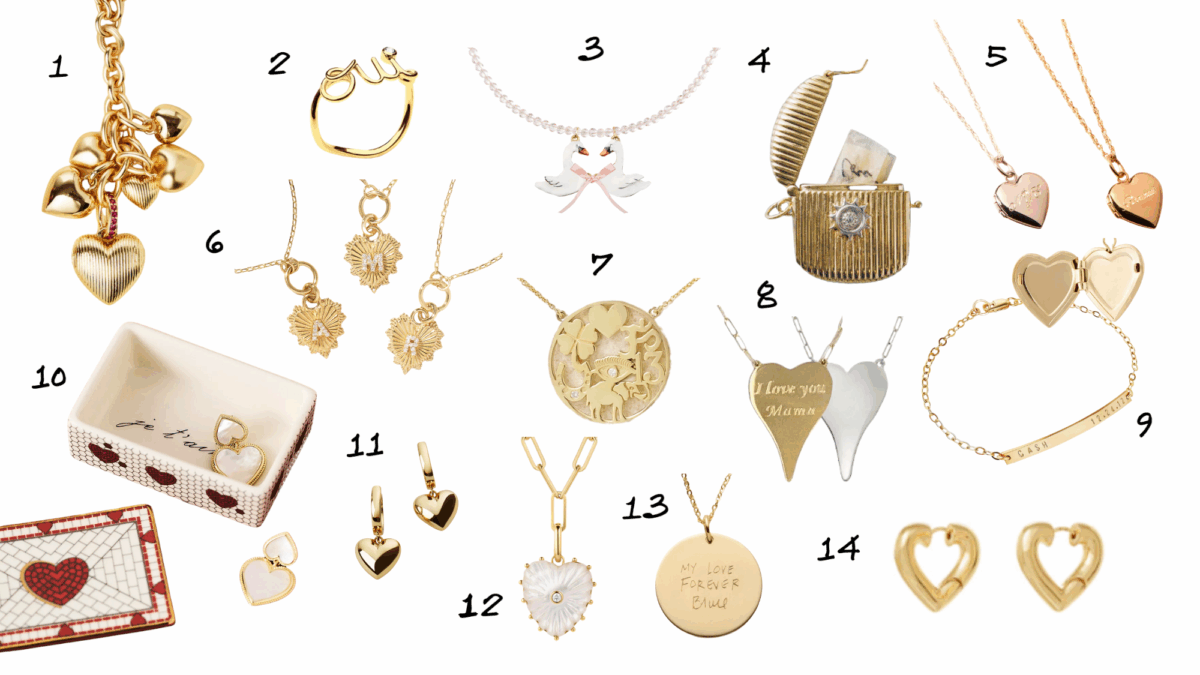 1. Roxanne Assouline Family of Hears Necklace, 2. Dior Oui Ring, 3. Susan Alexandra Kissing Swans Necklace, 4. HART Note Locket Necklace, 5. Personalized Catbird Locket, 6. Foundrae Initial Gold Diamond Necklace, 7. Jennifer Meyer Open Good Luck Pendant Necklace, 8. Jennifer Miller Custom Personalized Heart Necklace (Silver too), 9. Personalized Stamped Note/Location Bracelet, 10. Anthropologie Je T’aime Letter Trinket Box, 11. Ana Luisa Gold Heart Earrings, 12. Thatch Heart Clip Necklace, 13. Personalized Disc Necklace, 14. Roxanne Assoulin Heart Chubbies