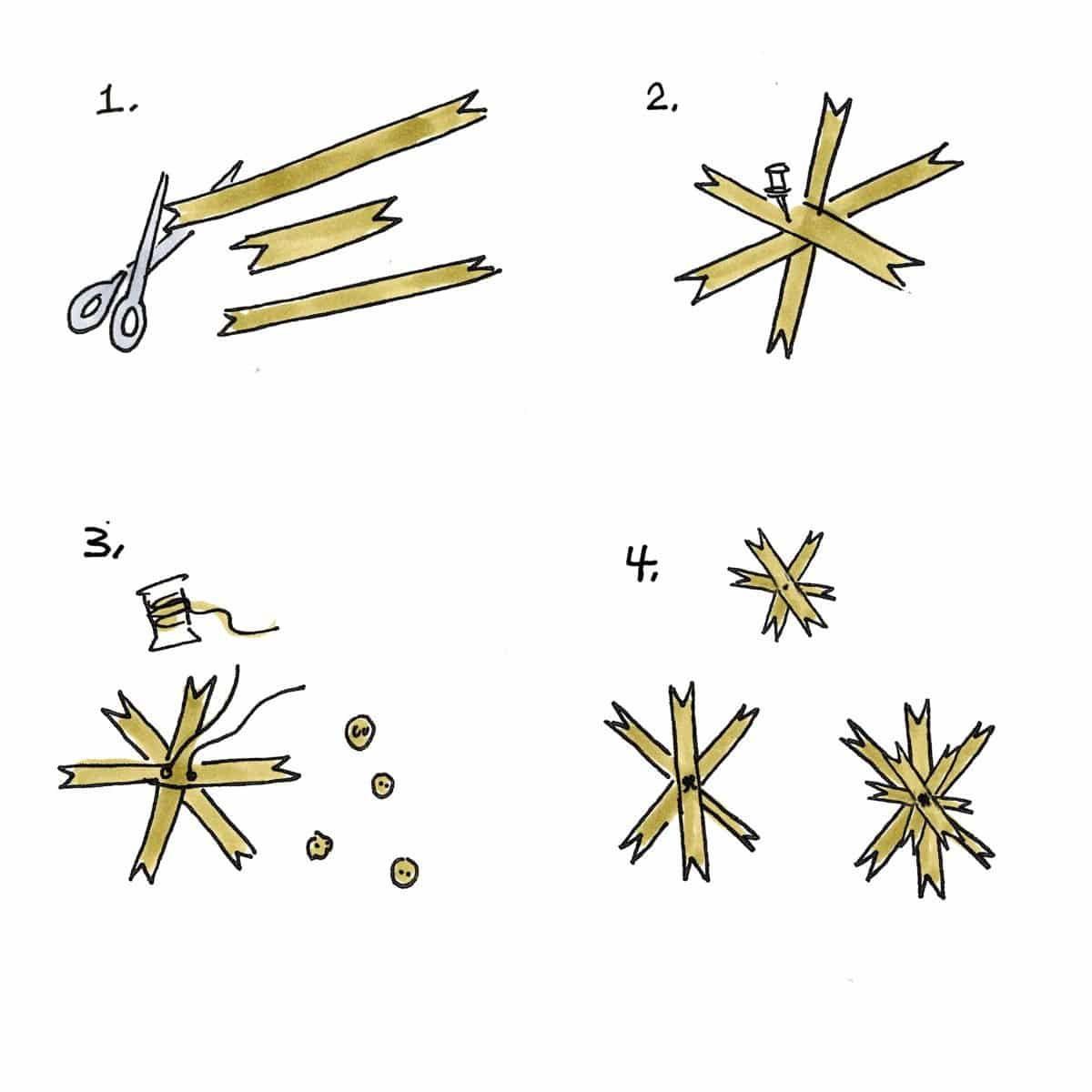 Step 3 Using a push pin or needle, poke two holes all the way through the stacked center of all four straws. Thread gold wire through one set of holes and out the other (as if you were sewing a button) and tie it together in back. If you want your stars to be extra decorative and secure, place a tiny gold or clear button on each side of the star’s center before threading the wire through and knotting to secure.